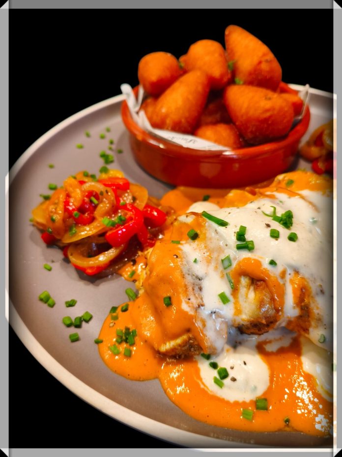 HomeVincetafoodGegrilde kipfilet met saus van gebrande paprika, paprika-ajuinchutney, sriracha-room en pom’pins