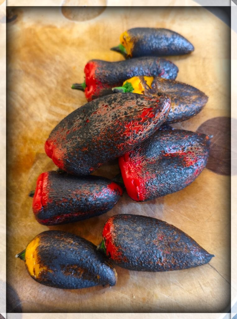 Rooster de hele paprika’s boven een gasvlam, op de BBQ of onder de grill tot de schil zwartgeblakerd is.