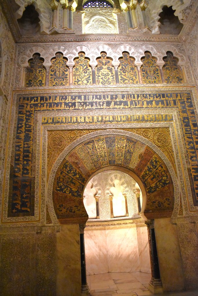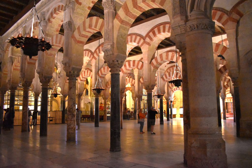De officiële naam is Cathedral de Nuestra Señora de la Asunción (Kathedraal van Onze-Lieve-Vrouw-Tenhemelopneming), maar bijna iedereen noemt het nog steeds de Mezquita. Mezquita betekent ‘moskee’ in het Spaans, maar in Córdoba verwijst de Mezquita naar het hele gebouw: de historische moskee én de latere kathedraal die erin is gebouwd. Toen de Moren Córdoba hadden veroverd op de Visigoten, bouwden ze als overwinningstrofee een grote moskee op de plaats waar de Visigotische basiliek stond. De Visigotische pilaren en kapitelen kregen een nieuwe bestemming en werden uitgebreid met o.a. pilaren uit Romeinse ruïnes. Het resultaat is een indrukwekkend bos met bijna negenhonderd zuilen en een veelvoud van rood-witte bogen in twee verdiepingen. Het verleent het geheel een extra ruimtelijke dimensie en ons het gevoel van tijdloosheid en verwondering. De stralende mihrab (gebedsnis) overdadig versierd met goudmozaïeken was de rustplaats van een originele koran.