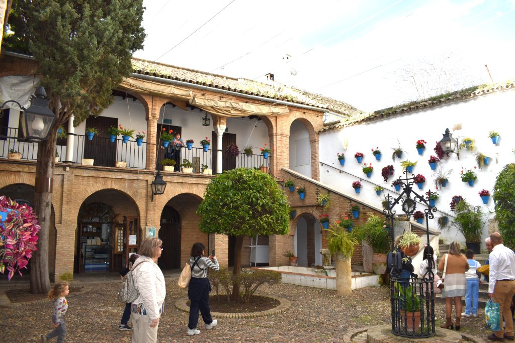 Onze gids Alba neemt ons vervolgens mee naar de Calle de las Flores, het meest gefotografeerde steegje in Córdoba. De witte muren hangen vol blauwe potten met geraniums. Op een bakstenen muurtje rond de fontein zitten de bewoners gezellig te keuvelen. Rond het binnenpleintje Zoco toont Alba ons de werkplaatsen van kunstenaars, die de oude handwerktradities in leven houden. Ze maken er oude muziekinstrumenten, lederen sandalen, delicaat leerwerk, keramieken potten, filigraan, zilver en andere sieraden die je kan kopen in hun aantrekkelijke winkeltjes. Het museum over de beroemde stierenvechters boeit ons minder. Toch is stierenvechten hier een cultureel erfgoed waar niet aan de torren valt. Het zijn evenementen die zelfs besproken worden in gewaardeerde culturele tijdschriften. We nemen wel even de tijd om binnen te springen in de middeleeuwse synagoge uit 1315 in Juderia, de oude Joodse wijk. Tot slot lopen we nog even over de Puente Romano, een loopbrug over de Guadalquivir waar gadgetverkopers hopen op de gulheid van de toeristen. Om een bezoekje te brengen aan het Alcazar de los Reyes, het 14e eeuws paleis van de christelijke vorsten, omringd met grote tuinen, is er jammer genoeg geen tijd over.