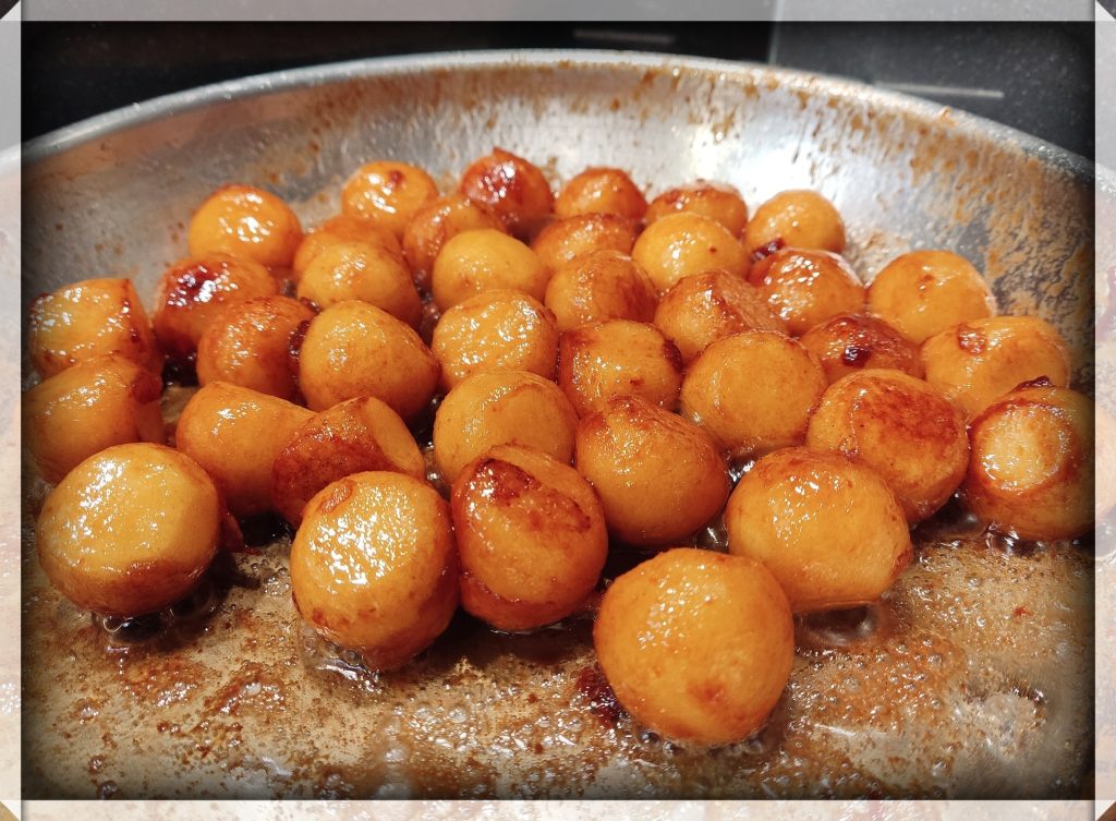 - Smelt boter in een pan, voeg de appelbolletjes toe.