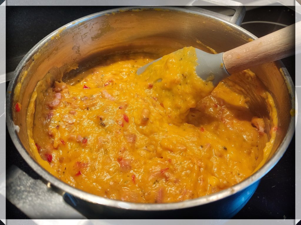 Voeg butternut, spekjes, tijm, nootmuskaat, paprikapoeder, peper en zout toe. Meng goed. Laat het mengsel minstens 2 uur opstijven in de koelkast (of 30 min in diepvries).
