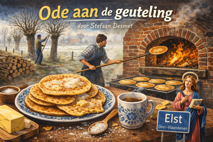 In het naburige dorp Elst bakt men traditioneel van januari tot begin maart – maar tegenwoordig ook langer – geutelingen. Dat zijn dikke, malse koeken die worden gebakken in een houtoven. Op mistige ochtenden knotten gespierde mannen en vrouwen de bomen die de weiden en de wandelpaden afzomen. Het hout wordt later gebruikt om de ovens warm te stoken. Een ‘geute’ deeg wordt uitgegoten op de kleitegels in de bloedhete oven. De geuteling zwelt, wordt uit de oven gehaald en op een rooster gekoeld. Later verslindt men de geutelingen meestal met boter en suiker, net zoals pannenkoeken.