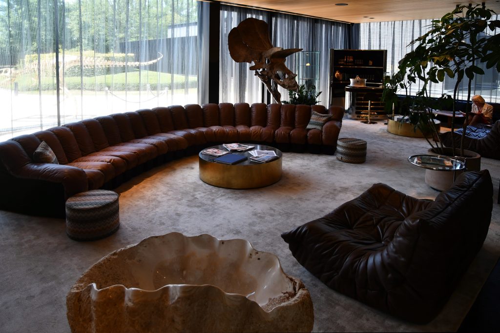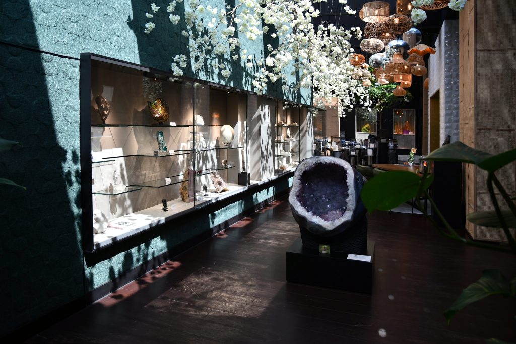 Na een glaasje bubbels als welkomstdrink weten we tijdens een rondleiding door een baliemedewerker niet waar eerst gekeken: mammoetonderdelen, decoraties met mineralen, amethisgeodes (holle stenen die aan de binnenkant bekleed zijn met schitterende kristallen) design- en vintageobjecten… ”Het zijn geen willekeurige decoraties” verduidelijkt de man, “maar de paradepaardjes van de eigenaar Jochen Leën, die zijn passie graag wil delen met anderen”. Elke ruimte is anders gedecoreerd. In het restaurant valt de groene wand op met natuurlijke kalkmortels en mossen die verwijzen naar de natuur van het omliggende Hoge Kempen boslandschap.