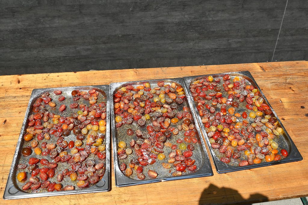 Op schalen liggen opengesneden kleine tomaatjes te drogen in de zon, een delicatesse die hij liever zelf maakt dan te moeten aankopen. Koken is voor hem veel meer dan zomaar een job. Het is zijn passie en dat weerspiegelt zich niet alleen in lekkere, maar ook echte kunststukjes.