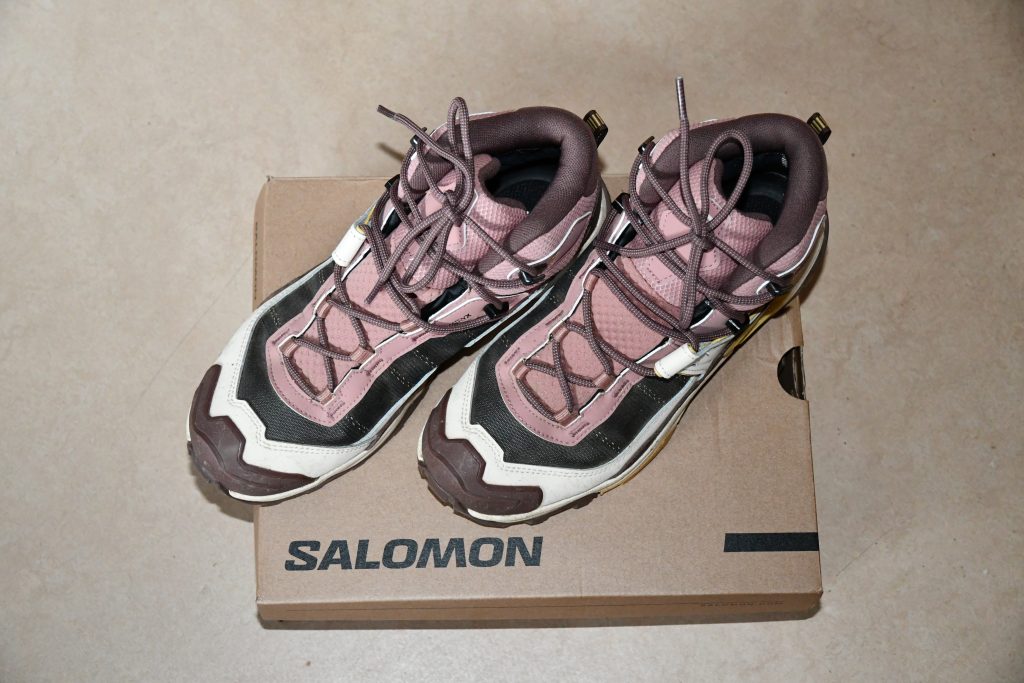Omdat mijn oude comfortabele lederen bergschoenen aan vernieuwing toe waren en na een paar slechte aankopen van schoenen die in de winkel goed pasten, maar na een langere wandeling toch ergens begonnen te knellen, wou ik niet het zoveelste paar kopen dat in de kast bleef staan. Omwille van handbagage moesten die ook zo licht mogelijk zijn. De bergschoen van het merk Salomon beantwoordt aan al die criteria: ze wegen ongeveer de helft (amper 750gram) van mijn oude bergschoenen, zijn waterdicht, hebben een stevige greep, de voeten bleven fris en ook na uren wandelen begonnen ze op geen enkel moment te knellen. Ik mocht ze uittesten, maar vanaf nu wil ik geen anderen meer.
