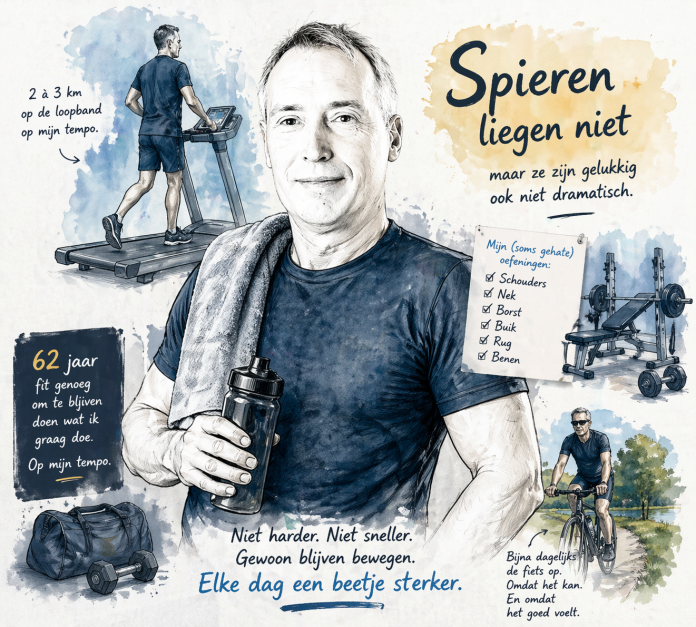 Ik stap op de loopband en doe mijn 2 à 3 kilometer. Geen marathon, geen heroïek — gewoon degelijk lopen, soms wat steviger versnellen als ik me goed voel.